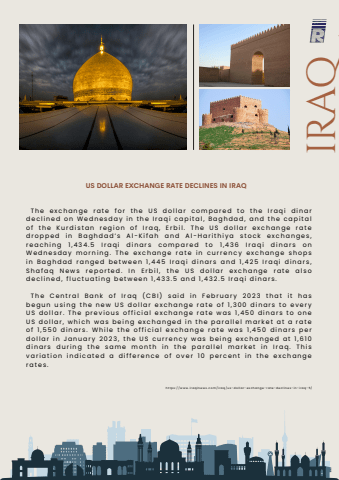 IRAQUS DOLLAR EXCHANGE RATE DECLINES IN IRAQT h e e x c hange rat e f o r t h e US do l lar c ompar ed t o t h e Iraqi di narde c l i n ed o n Wedn e sday i n t h e Iraqi capital , Baghdad, and t h e capitalo f t h e K u rdi s tan r egi o n o f Iraq, E rbi l . T h e US do l lar e x c hange rat edr opped i n Baghdad%u2019 s Al - K ifah and Al -Harit h i ya s t o c k e x c hange s ,r eac h i ng 1 , 4 3 4 . 5 Iraqi di nar s c ompar ed t o 1 , 4 3 6 Iraqi di nar s o nWedn e sday mo r n i ng. T h e e x c hange rat e i n c u rr e n c y e x c hange s h opsi n Baghdad ranged be t w e e n 1 , 4 4 5 Iraqi di nar s and 1 , 4 2 5 Iraqi di nar s ,S hafaq N e w s r epo rt ed. I n E rbi l , t h e US do l lar e x c hange rat e al s ode c l i n ed, fl u c t uati ng be t w e e n 1 , 4 3 3 . 5 and 1 , 4 3 2 . 5 Iraqi di nar s .T h e C e n tral Ban k o f Iraq ( C B I ) said i n F ebr uar y 2 0 2 3 t hat it hasbegu n u s i ng t h e n e w US do l lar e x c hange rat e o f 1 , 3 0 0 di nar s t o e v e r yUS do l lar. T h e pr e v i o u s o ffi c ial e x c hange rat e w as 1 , 4 5 0 di nar s t o o n eUS do l lar, w h i c h w as be i ng e x c hanged i n t h e paral l e l mar k e t at a rat eo f 1 , 5 5 0 di nar s . Wh i l e t h e o ffi c ial e x c hange rat e w as 1 , 4 5 0 di nar s pe rdo l lar i n Jan uar y 2 0 2 3 , t h e US c u rr e n c y w as be i ng e x c hanged at 1 , 6 1 0di nar s du ri ng t h e same mo n t h i n t h e paral l e l mar k e t i n Iraq. T h i svariati o n i ndi cat ed a diff e r e n c e o f o v e r 1 0 pe r c e n t i n t h e e x c hangerat e s .h ttps : / / w w w . iraqi n e w s . c om/ iraq/ u s -do l lar - e x c hange - rat e -de c l i n e s - i n - iraq- 5 /