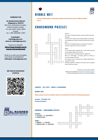 CONTACT USAl-Rashed InternationalShipping Co. (KSCC)9th Floor, Al Rashed Complex,Fahad Al Salem Street,P.O. Box 20241, Safat-13063Kuwait.Tel: + 965 22912800 / 2801kuwait@alrashedgroup.comwww.al-rashedgroup.comFind us on Linkedin:https://www.linkedin.com/company/alrashedkuwaitWrite to us with your thoughts,comments and feedback:editor@al-rashedgroup.comQR Code for NewsletterArchivesRIDDLE ME!!I am an odd number. Take away a letter and I become even. What numberam I?Answers in next month's editionSend in your answers to editor@al-rashedgroup.comCorrect answers get a shout-out in the next editionCROSSWORD PUZ ZLE!!ANSWERS - JULY 2025 - RIDDLE & CROSSWORDRIDDLE ME!!What comes once in a minute, twice in a moment, but never in a thousand years?Answer : The letter %u201cM%u201dCorrect Answers :Across :3. To secure a shipment inside a carrier's vehicle to preventdamage.7 .The transfer of rights, duties, responsibilities, and benefitsof an agreement, contract, orfinancial instrument to a thirdparty.8. The act of requesting space and equipment aboard avessel for cargo which is to be transported.Down :1. An enclosed railcar, typically forty- to fifty-feet long, usedfor packaged freight and some bulk2. The conversion of analogue data into digital form.4.The net advantage a company gains by sharing acommon location with other5. A vehicle's return movement from original destination tooriginal point origin.6. Selling of goods or services to the buyer with the highestoffer at the time of a sale.ANSWERS - CROSSWORD PUZ ZLE!!ACROSS :4. ACTUARY / 6. EQUIPMENT /7. APPRECIAT IONDOWN :1. MARKUP / 2. BACKER3. FORECAST ING / 5. GOODWILL