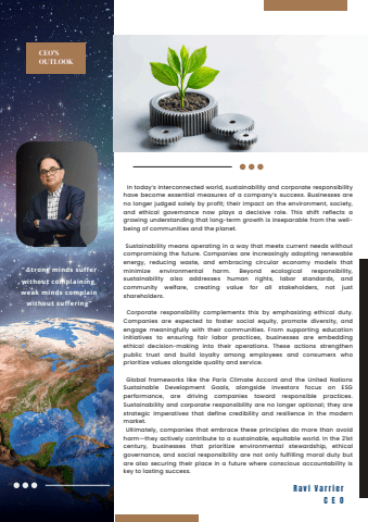 %u201c Strong minds sufferwithout complaining,weak minds complainwithout suffering%u201dIn today%u2019s interconnected world, sustainability and corporate responsibilityhave become essential measures of a company%u2019s success. Businesses areno longer judged solely by profit; their impact on the environment, society,and ethical governance now plays a decisive role. This shift reflects agrowing understanding that long-term growth is inseparable from the wellbeing of communities and the planet.Sustainability means operating in a way that meets current needs withoutcompromising the future. Companies are increasingly adopting renewableenergy, reducing waste, and embracing circular economy models thatminimize environmental harm. Beyond ecological responsibility,sustainability also addresses human rights, labor standards, andcommunity welfare, creating value for all stakeholders, not justshareholders.Corporate responsibility complements this by emphasizing ethical duty.Companies are expected to foster social equity, promote diversity, andengage meaningfully with their communities. From supporting educationinitiatives to ensuring fair labor practices, businesses are embeddingethical decision-making into their operations. These actions strengthenpublic trust and build loyalty among employees and consumers whoprioritize values alongside quality and service.Global frameworks like the Paris Climate Accord and the United NationsSustainable Development Goals, alongside investors focus on ESGperformance, are driving companies toward responsible practices.Sustainability and corporate responsibility are no longer optional; they arestrategic imperatives that define credibility and resilience in the modernmarket.Ultimately, companies that embrace these principles do more than avoidharm%u2014they actively contribute to a sustainable, equitable world. In the 21stcentury, businesses that prioritize environmental stewardship, ethicalgovernance, and social responsibility are not only fulfilling moral duty butare also securing their place in a future where conscious accountability iskey to lasting success.R a v i V a r r i e rC E OCEO'SOUTLOOK