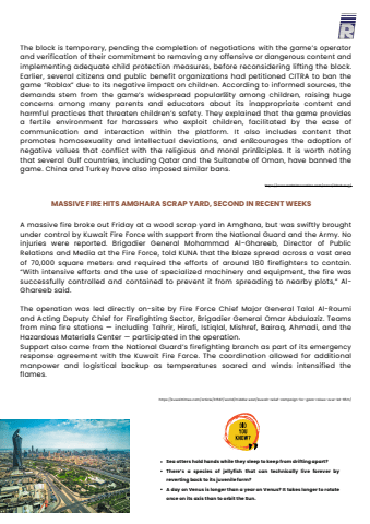 Sea otters hold hands while they sleep to keep from drifting apart?There%u2019s a species of jellyfish that can technically live forever byreverting back to its juvenile form?A day on Venus is longer than a year on Venus? It takes longer to rotateonce on its axis than to orbit the Sun.The block is temporary, pending the completion of negotiations with the game%u2019s operatorand verification of their commitment to removing any offensive or dangerous content andimplementing adequate child protection measures, before reconsidering lifting the block.Earlier, several citizens and public benefit organizations had petitioned CITRA to ban thegame %u201cRoblox%u201d due to its negative impact on children. According to informed sources, thedemands stem from the game%u2019s widespread popular ity among children, raising hugeconcerns among many parents and educators about its inappropriate content andharmful practices that threaten children%u2019s safety. They explained that the game providesa fertile environment for harassers who exploit children, facilitated by the ease ofcommunication and interaction within the platform. It also includes content thatpromotes homosexuality and intellectual deviations, and en courages the adoption ofnegative values that conflict with the religious and moral prin ciples. It is worth notingthat several Gulf countries, including Qatar and the Sultanate of Oman, have banned thegame. China and Turkey have also imposed similar bans.https://www.arabtimesonline.com/news/22nd-aug/MASSIVE FIRE HITS AMGHARA SCRAP YARD, SECOND IN RECENT WEEKSA massive fire broke out Friday at a wood scrap yard in Amghara, but was swiftly broughtunder control by Kuwait Fire Force with support from the National Guard and the Army. Noinjuries were reported. Brigadier General Mohammad Al-Ghareeb, Director of PublicRelations and Media at the Fire Force, told KUNA that the blaze spread across a vast areaof 70,000 square meters and required the efforts of around 180 firefighters to contain.%u201cWith intensive efforts and the use of specialized machinery and equipment, the fire wassuccessfully controlled and contained to prevent it from spreading to nearby plots,%u201d Al- Ghareeb said.The operation was led directly on-site by Fire Force Chief Major General Talal Al-Roumiand Acting Deputy Chief for Firefighting Sector, Brigadier General Omar Abdulaziz. Teamsfrom nine fire stations %u2014 including Tahrir, Hirafi, Istiqlal, Mishref, Bairaq, Ahmadi, and theHazardous Materials Center %u2014 participated in the operation.Support also came from the National Guard%u2019s firefighting branch as part of its emergencyresponse agreement with the Kuwait Fire Force. The coordination allowed for additionalmanpower and logistical backup as temperatures soared and winds intensified theflames.https://kuwaittimes.com/article/31587/world/middle-east/kuwait-relief-campaign-for-gaza-raises-over-kd-65m/