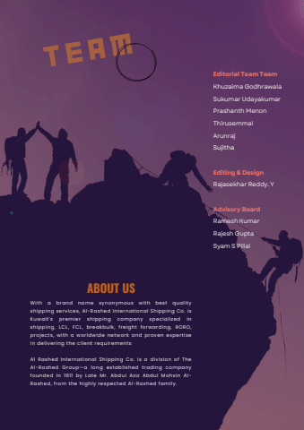 t e a mABOUT USWith a brand name synonymous with best qualityshipping services, Al-Rashed International Shipping Co. isKuwait%u2019s premier shipping company specialized inshipping, LCL, FCL, breakbulk, freight forwarding, RORO,projects, with a worldwide network and proven expertisein delivering the client requirementsAl Rashed International Shipping Co. is a division of TheAl-Rashed Group%u2014a long established trading companyfounded in 1911 by Late Mr. Abdul Aziz Abdul Mohsin AlRashed, from the highly respected Al-Rashed family.Editorial Team TeamKhuzaima GodhrawalaSukumar UdayakumarPrashanth MenonThirusemmalArunrajSujithaEditing & DesignRajasekhar Reddy. YAdvisory BoardRamesh KumarRajesh GuptaSyam S Pillai