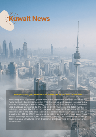 Reflecting both population growth and urban expansion, statistics issued by thePublic Authority for Civil Information (PACI) revealed a 0.9 percent increase in thenumber of buildings in Kuwait during the first half of 2025, which is an addition of1,982 buildings compared to the end of 2024. Therefore, the total number ofbuildings reached 224,615 as of the end of June 2025, up from 222,633 inDecember 2024. The data also showed a 1.1 percent decrease in vacant buildings,dropping by 253 to 17,767, compared to 18,020 at the end of last year. Thesevacant buildings include 5,654 residential buildings, 50 commercial buildings,2,823 marginal structures, 8,421 traditional buildings, and 805 buildings underconstruction.Continuing....KUWAIT ADDS 1,982 BUILDINGS IN 6 MONTHS AS VACANCY RATE DIPSKuwait News