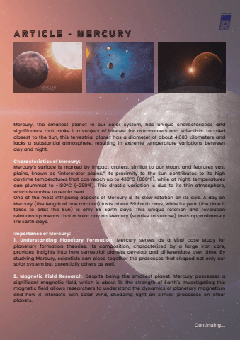 Mercury, the smallest planet in our solar system, has unique characteristics andsignificance that make it a subject of interest for astronomers and scientists. Locatedclosest to the Sun, this terrestrial planet has a diameter of about 4,880 kilometers andlacks a substantial atmosphere, resulting in extreme temperature variations betweenday and night.Characteristics of Mercury:Mercury's surface is marked by impact craters, similar to our Moon, and features vastplains, known as %u201cintercrater plains.%u201d Its proximity to the Sun contributes to its highdaytime temperatures that can reach up to 430%u00b0C (800%u00b0F), while at night, temperaturescan plummet to -180%u00b0C (-290%u00b0F). This drastic variation is due to its thin atmosphere,which is unable to retain heat.One of the most intriguing aspects of Mercury is its slow rotation on its axis. A day onMercury (the length of one rotation) lasts about 59 Earth days, while its year (the time ittakes to orbit the Sun) is only 88 Earth days. This unique rotation and revolutionrelationship means that a solar day on Mercury (sunrise to sunrise) lasts approximately176 Earth days.Importance of Mercury:1. Understanding Planetary Formation: Mercury serves as a vital case study forplanetary formation theories. Its composition, characterized by a large iron core,provides insights into how terrestrial planets develop and differentiate over time. Bystudying Mercury, scientists can piece together the processes that shaped not only oursolar system but potentially others as well.2. Magnetic Field Research: Despite being the smallest planet, Mercury possesses asignificant magnetic field, which is about 1% the strength of Earth's. Investigating thismagnetic field allows researchers to understand the dynamics of planetary magnetismand how it interacts with solar wind, shedding light on similar processes on otherplanets.Continuing....A R T I C L E - m e r c u r y